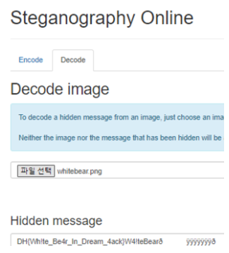 - 해당 사이트에서 decode에 사진을 입력하면 hidden message로 DH{Wh!te_Be4r_In_Dream_4ack}가 나온다.